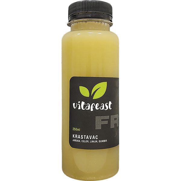 FRESH Krastavac, sa izbalansiranim količinama krastavca i celera, predstavlja nezamenjivog partnera u izbacivanju toksina iz organizma, dok ujedno pomaže i u hidrataciji tela. Sadrži visok nivo vitamina K, A, B1, B6, C i D, kao i savršen odnos natrijuma i kalijuma što ga čini odličnim diuretikom. Đumbir, tačnije komponenta đumbira koja se zove gingerol, može delovati protivupalno i predstavlja odličan antioksidans, a zbog kombinacija limuna i đumbira u njemu, FRESH Krastavac pospešuje stvaranje belih krvnih zrnaca i na prirodan način jača Vaš imuni sistem.